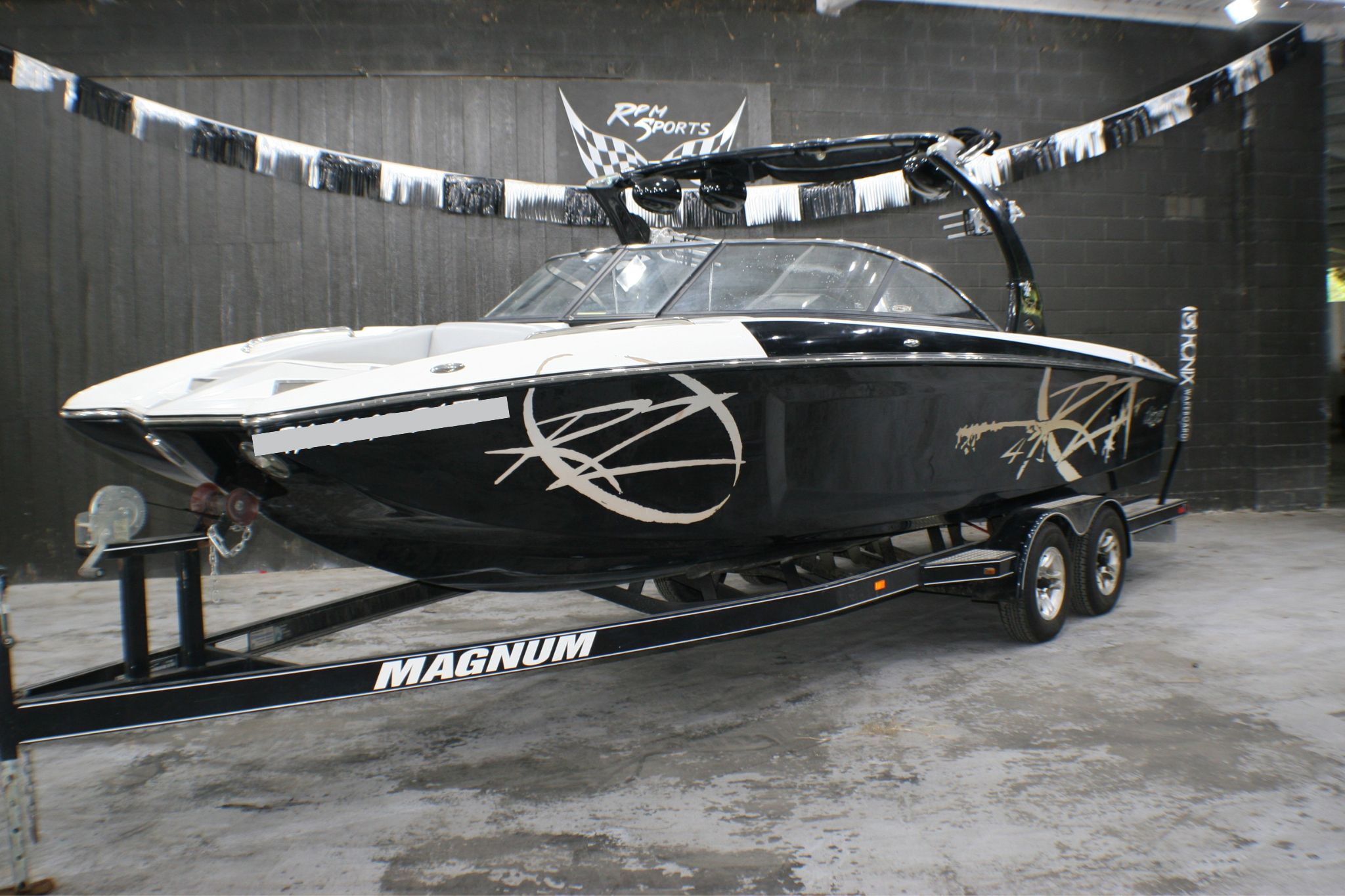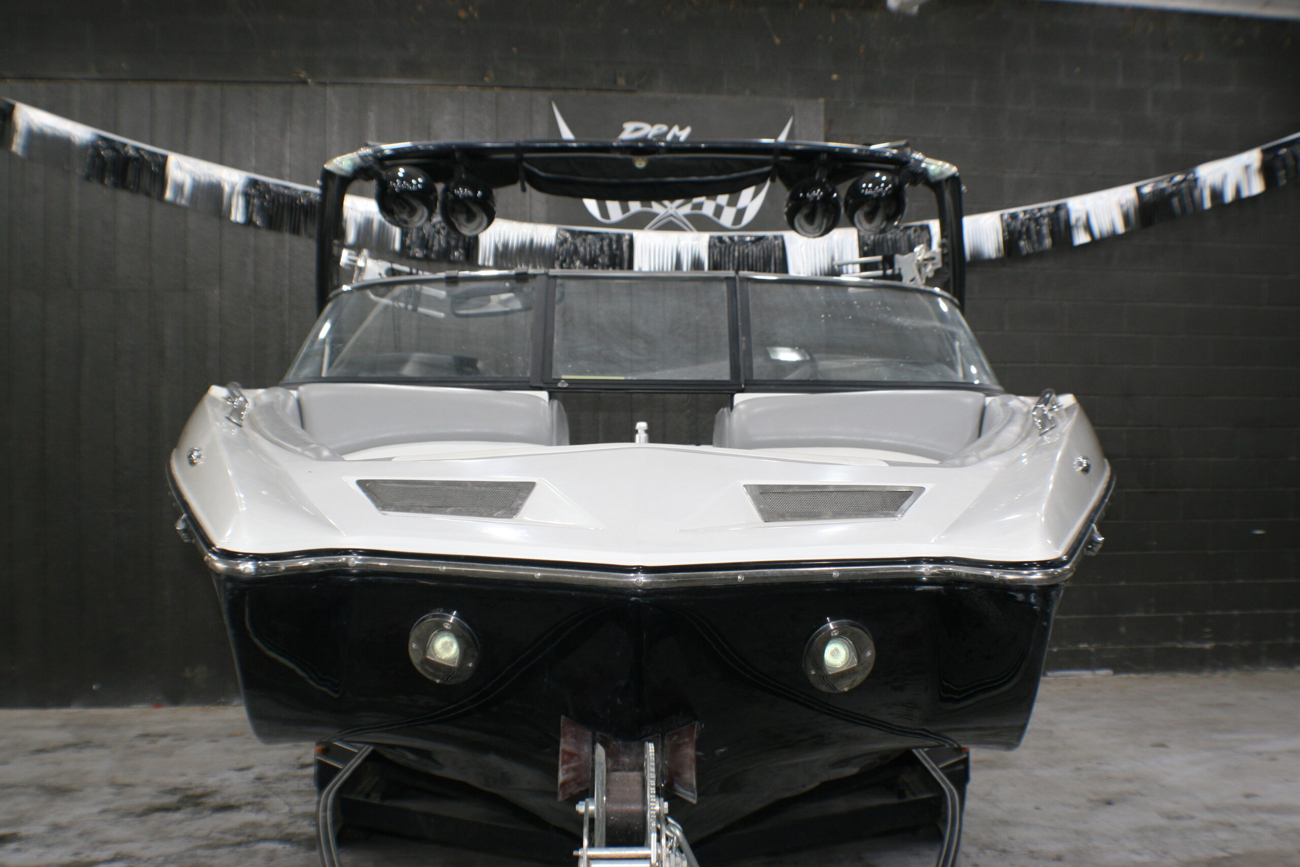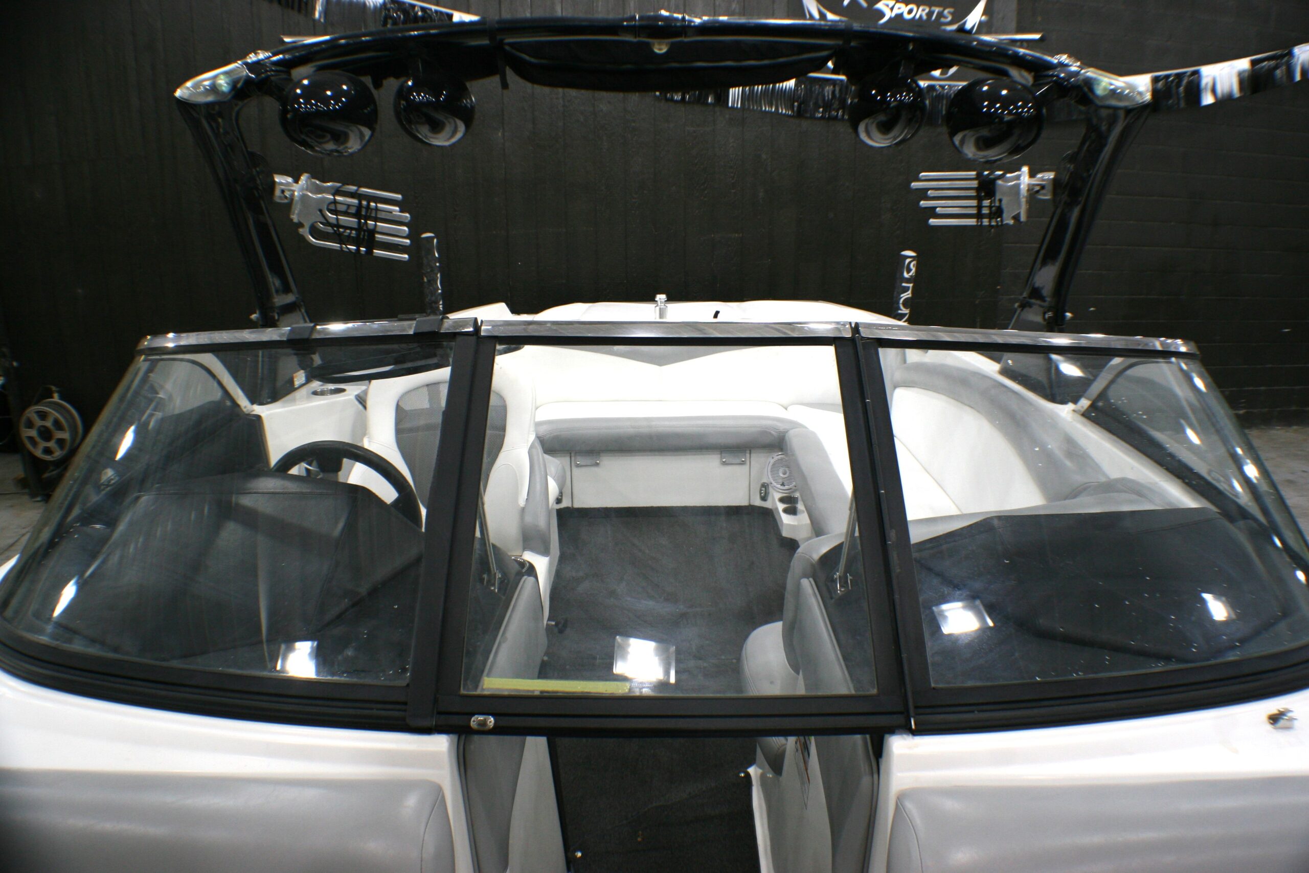 boat. This boat has a stylish wake tower with speakers and a Bimini top
