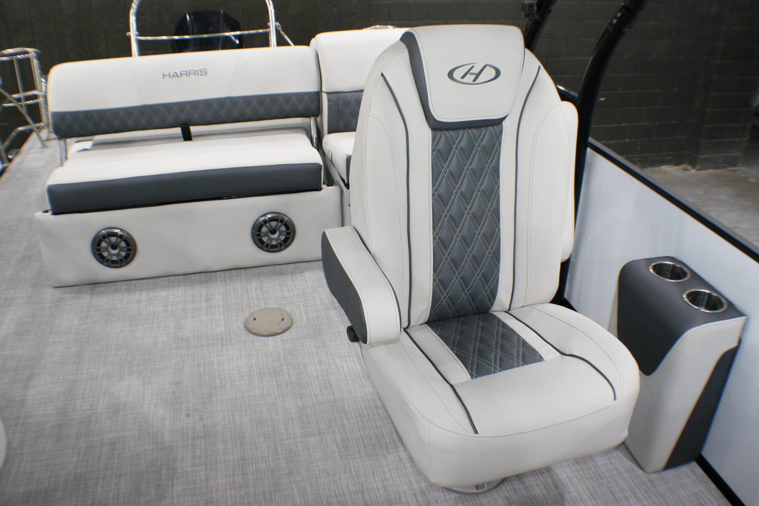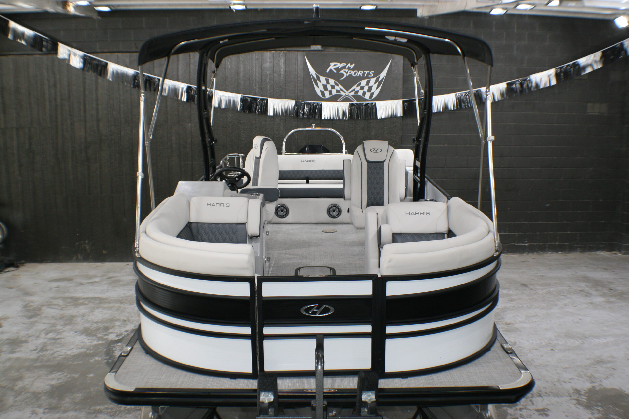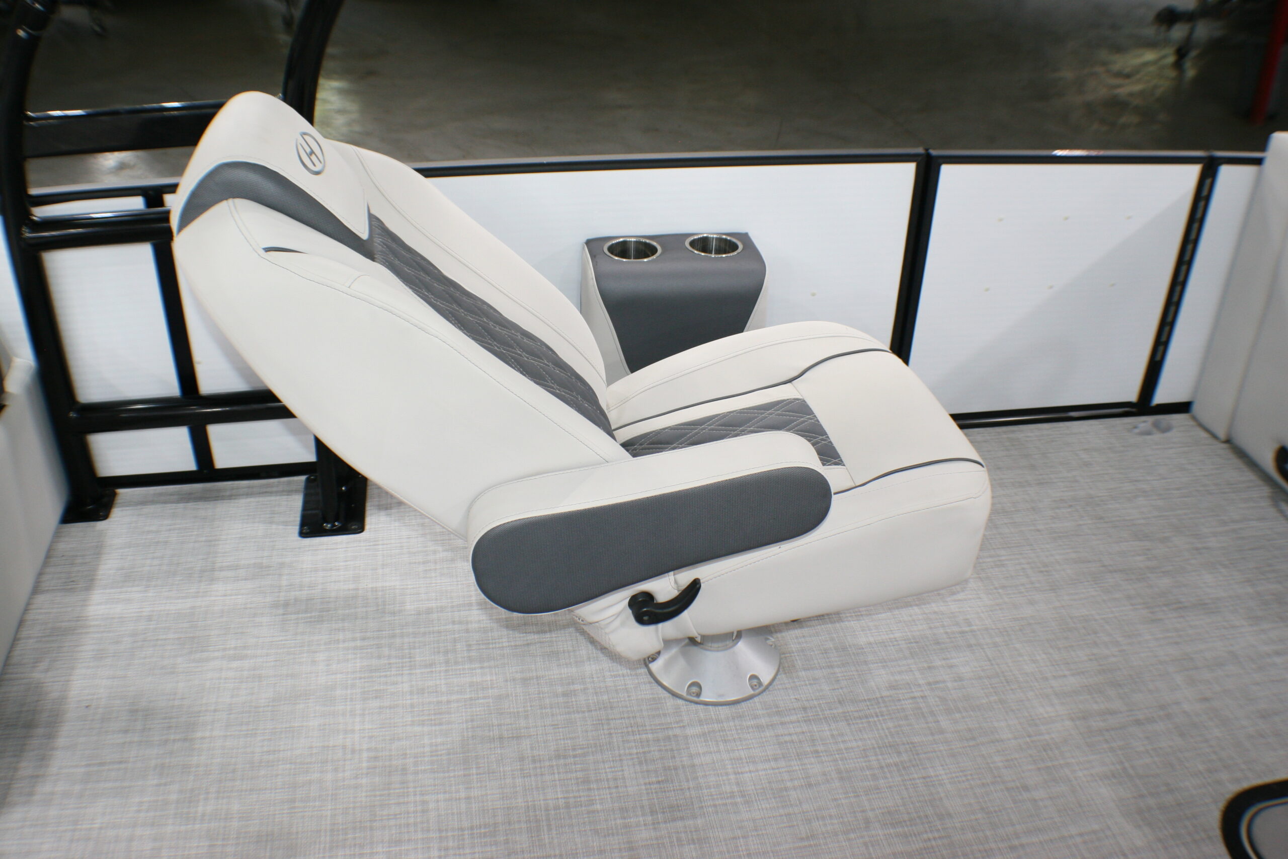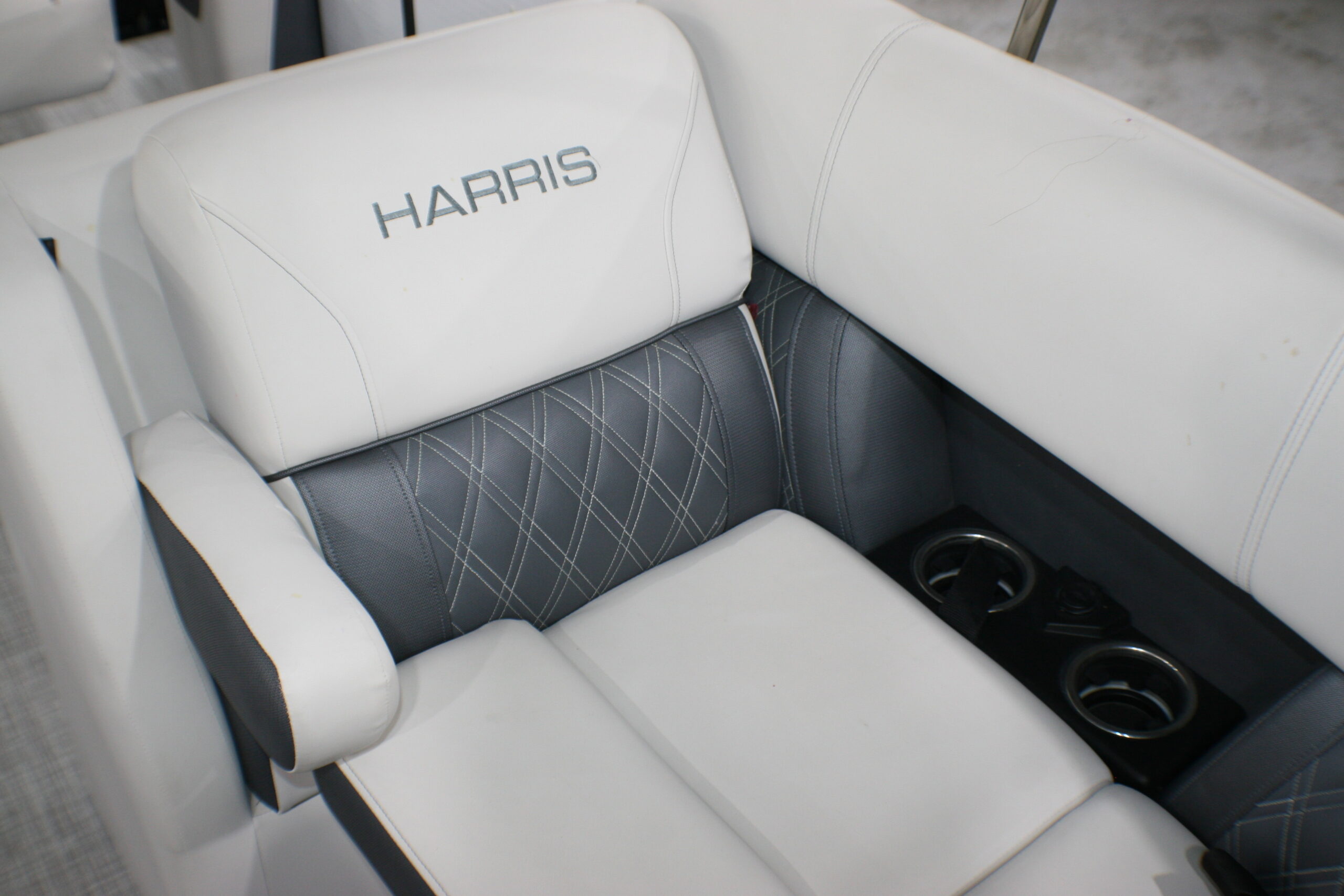 This Harris Sunliner 230 Sport mixes impressive handling with a higher level of trim and convenience. The exterior features a fence profile, highlighted by a sleek taper and black rails. Jump on board you’ll find an upgraded interior, with pillow-top furniture covered in new soft-touch vinyl and lumbar recesses. There’s a pair of cup holders, along with dual USB ports to top off electronics, placed within each cutaway.