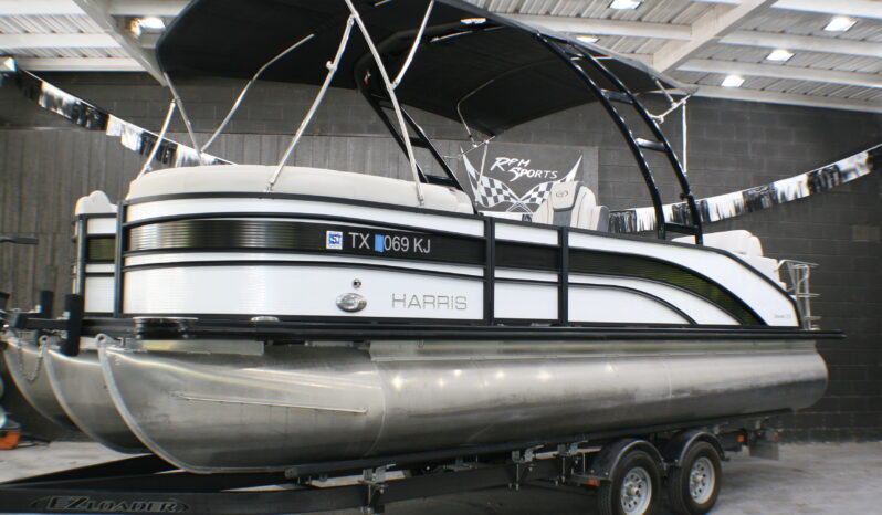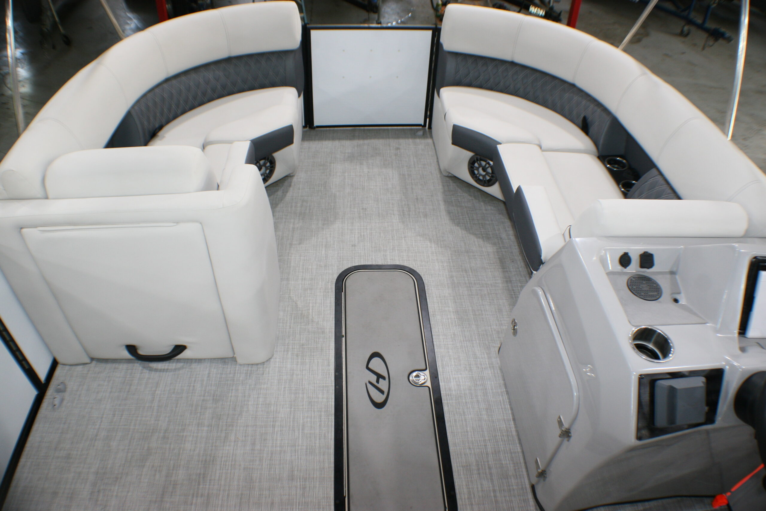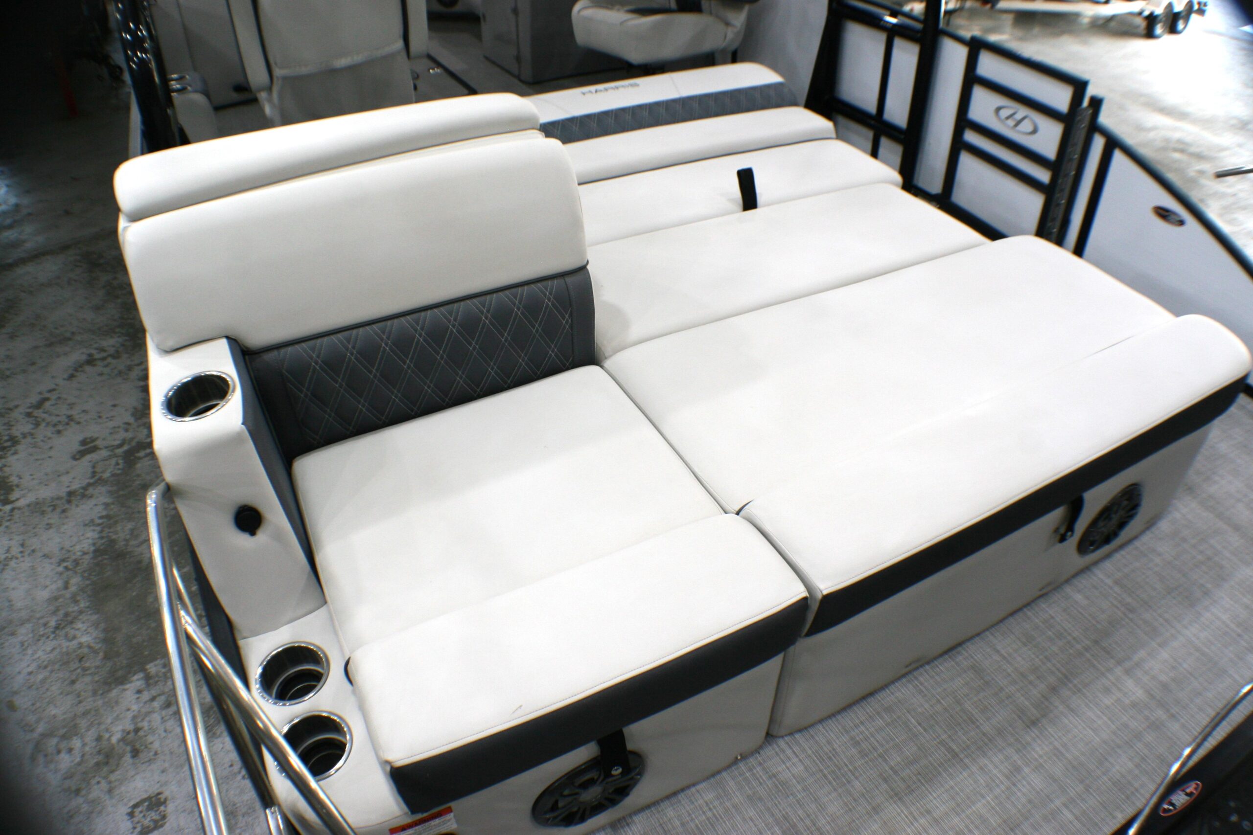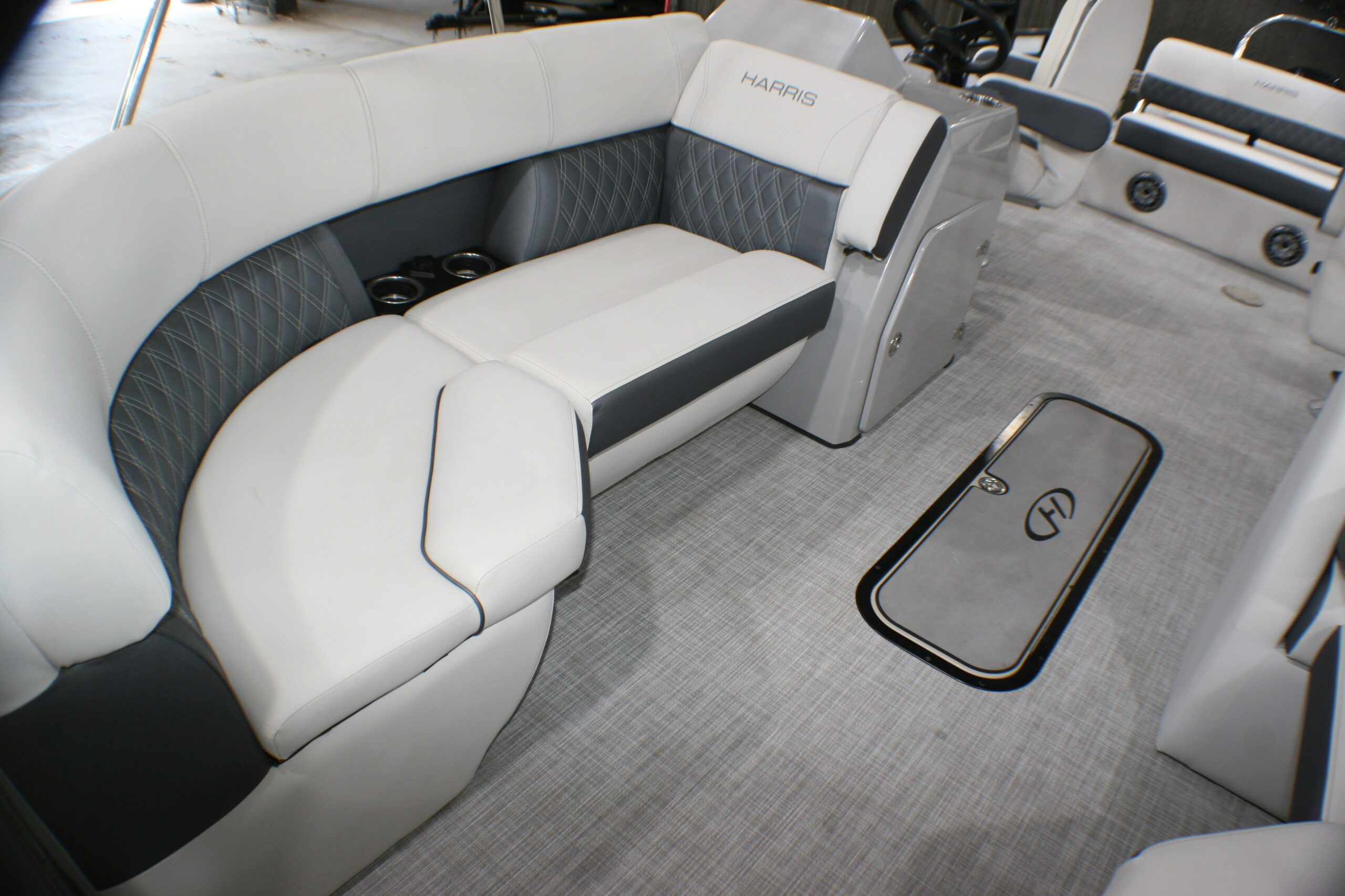 This Harris Sunliner 230 Sport mixes impressive handling with a higher level of trim and convenience. The exterior features a fence profile, highlighted by a sleek taper and black rails. Jump on board you’ll find an upgraded interior, with pillow-top furniture covered in new soft-touch vinyl and lumbar recesses. There’s a pair of cup holders, along with dual USB ports to top off electronics, placed within each cutaway.